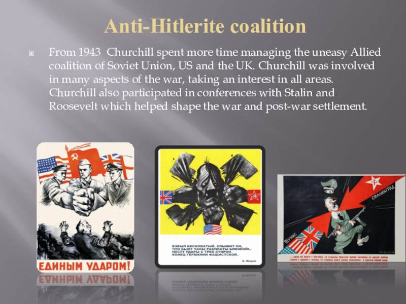 Allied coalition of Soviet Union, US and the UK. Churchill was involved in many aspects of the war, taking an interest in all areas. Churchill also participated in conferences with Stalin and Roosevelt which helped shape the war and post-war settlement.