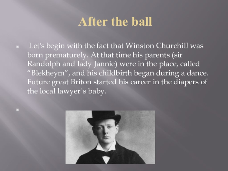 Churchill was born prematurely. At that time his parents (sir Randolph and lady Jannie) were in the place, called “Blekheym”, and his childbirth began during a dance. Future great Briton started his career in the diapers of the local lawyer`s baby.