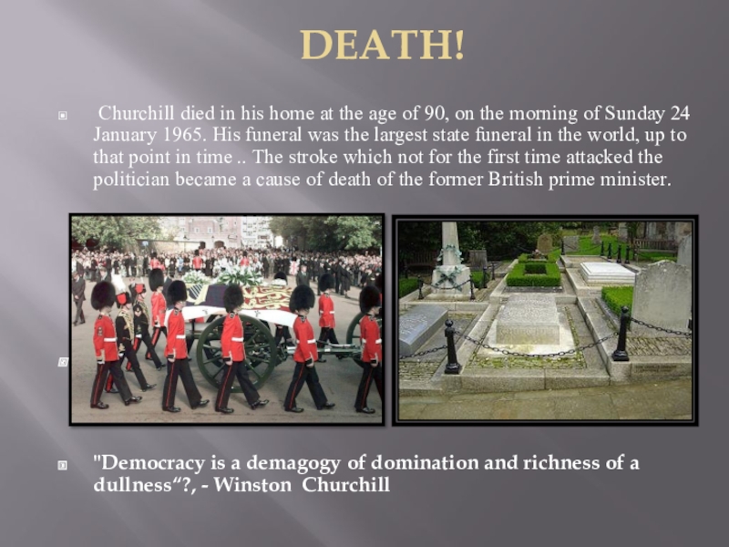 90, on the morning of Sunday 24 January 1965. His funeral was the largest state funeral in the world, up to that point in time .. The stroke which not for the first time attacked the politician became a cause of death of the former British prime minister.
