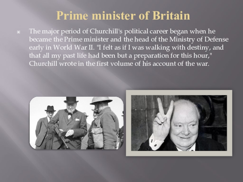 began when he became the Prime minister and the head of the Ministry of Defense early in World War II. "I felt as if I was walking with destiny, and that all my past life had been but a preparation for this hour," Churchill wrote in the first volume of his account of the war.