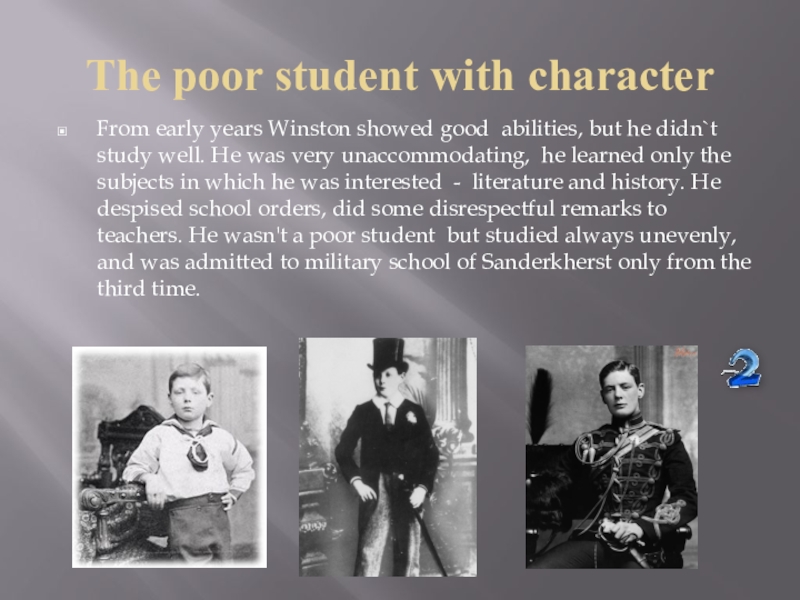 abilities, but he didn`t study well. He was very unaccommodating, he learned only the subjects in which he was interested - literature and history. He despised school orders, did some disrespectful remarks to teachers. He wasn't a poor student but studied always unevenly, and was admitted to military school of Sanderkherst only from the third time.