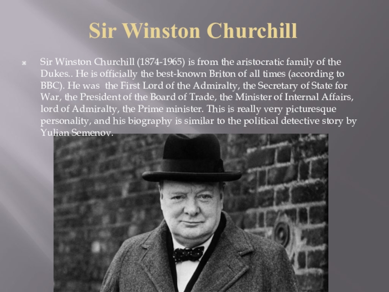 family of the Dukes.. He is officially the best-known Briton of all times (according to BBC). He was the First Lord of the Admiralty, the Secretary of State for War, the President of the Board of Trade, the Minister of Internal Affairs, lord of Admiralty, the Prime minister. This is really very picturesque personality, and his biography is similar to the political detective story by Yulian Semenov.