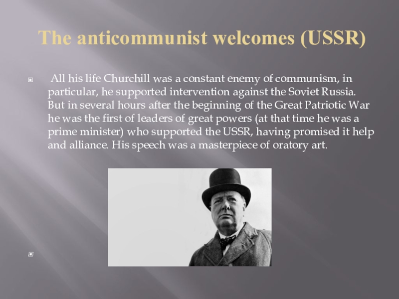 constant enemy of communism, in particular, he supported intervention against the Soviet Russia. But in several hours after the beginning of the Great Patriotic War he was the first of leaders of great powers (at that time he was a prime minister) who supported the USSR, having promised it help and alliance. His speech was a masterpiece of oratory art.