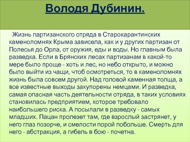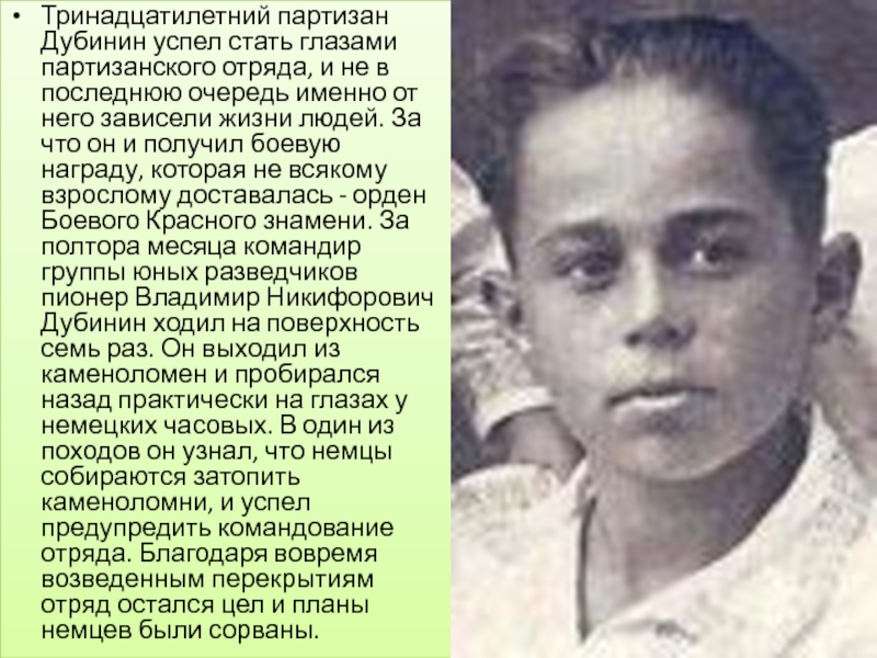 Слайд 22Тринадцатилетний партизан Дубинин успел стать глазами партизанского отряда, и не в
