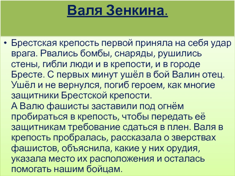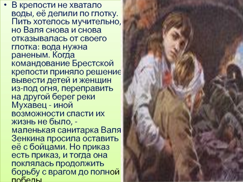 мучительно, но Валя снова и снова отказывалась от своего глотка: вода нужна раненым. Когда командование Брестской крепости приняло решение вывести детей и женщин из-под огня, переправить на другой берег реки Мухавец - иной возможности спасти их жизнь не было, - маленькая санитарка Валя Зенкина просила оставить её с бойцами. Но приказ есть приказ, и тогда она поклялась продолжить борьбу с врагом до полной победы.