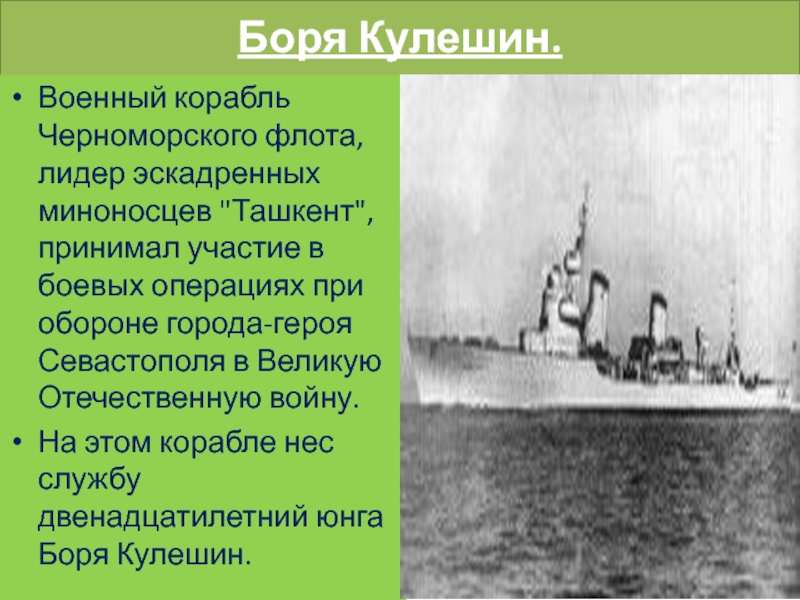 На этом корабле нес службу двенадцатилетний юнга Боря Кулешин.