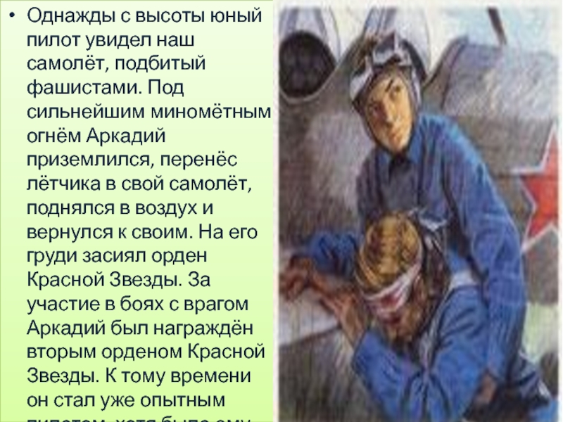 сильнейшим миномётным огнём Аркадий приземлился, перенёс лётчика в свой самолёт, поднялся в воздух и вернулся к своим. На его груди засиял орден Красной Звезды. За участие в боях с врагом Аркадий был награждён вторым орденом Красной Звезды. К тому времени он стал уже опытным пилотом, хотя было ему пятнадцать лет.