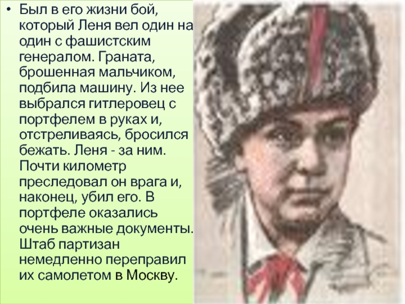с фашистским генералом. Граната, брошенная мальчиком, подбила машину. Из нее выбрался гитлеровец с портфелем в руках и, отстреливаясь, бросился бежать. Леня - за ним. Почти километр преследовал он врага и, наконец, убил его. В портфеле оказались очень важные документы. Штаб партизан немедленно переправил их самолетом в Москву.