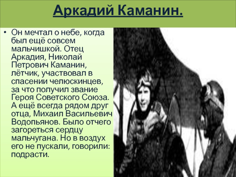 Аркадия, Николай Петрович Каманин, лётчик, участвовал в спасении челюскинцев, за что получил звание Героя Советского Союза. А ещё всегда рядом друг отца, Михаил Васильевич Водопьянов. Было отчего загореться сердцу мальчугана. Но в воздух его не пускали, говорили: подрасти.