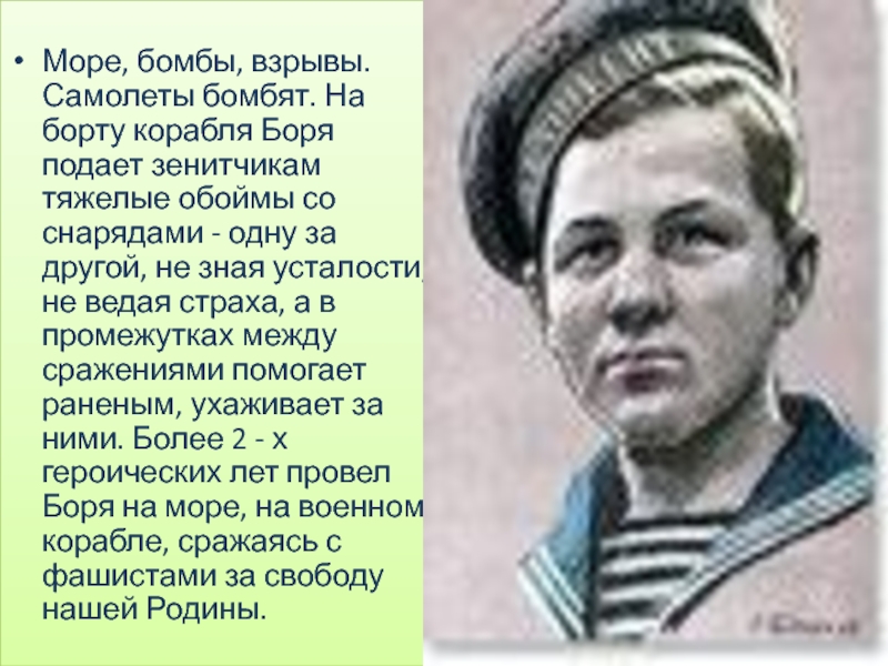 тяжелые обоймы со снарядами - одну за другой, не зная усталости, не ведая страха, а в промежутках между сражениями помогает раненым, ухаживает за ними. Более 2 - х героических лет провел Боря на море, на военном корабле, сражаясь с фашистами за свободу нашей Родины.