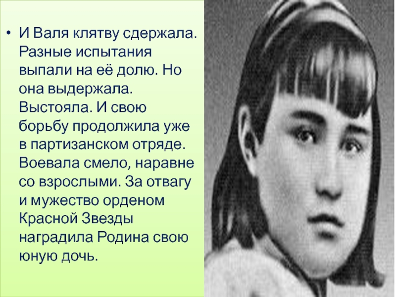 А Валю фашисты заставили под огнём пробираться в крепость, чтобы передать её защитникам требование сдаться в плен. Валя в крепость пробралась, рассказала о зверствах фашистов, объяснила, какие у них орудия, указала место их расположения и осталась помогать нашим бойцам.