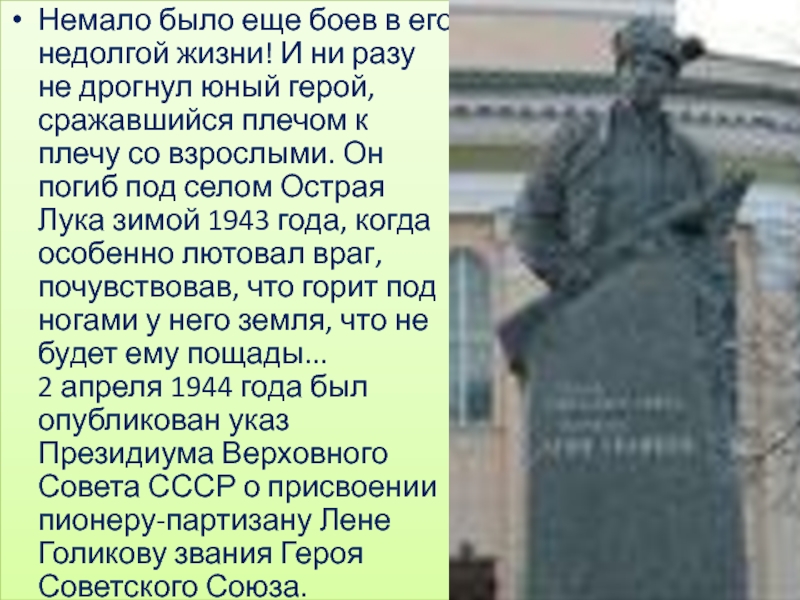 2 апреля 1944 года был опубликован указ Президиума Верховного Совета СССР о присвоении пионеру-партизану Лене Голикову звания Героя Советского Союза.