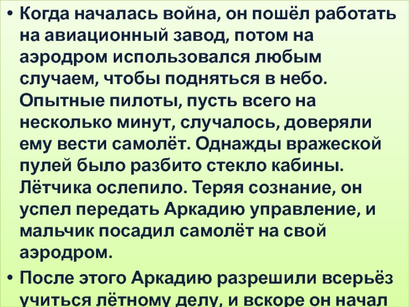 аэродром использовался любым случаем, чтобы подняться в небо. Опытные пилоты, пусть всего на несколько минут, случалось, доверяли ему вести самолёт. Однажды вражеской пулей было разбито стекло кабины. Лётчика ослепило. Теряя сознание, он успел передать Аркадию управление, и мальчик посадил самолёт на свой аэродром.