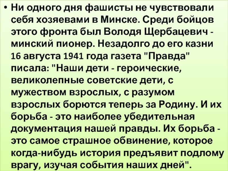 бойцов этого фронта был Володя Щербацевич - минский пионер. Незадолго до его казни 16 августа 1941 года газета "Правда" писала: "Наши дети - героические, великолепные советские дети, с мужеством взрослых, с разумом взрослых борются теперь за Родину. И их борьба - это наиболее убедительная документация нашей правды. Их борьба - это самое страшное обвинение, которое когда-нибудь история предъявит подлому врагу, изучая события наших дней".