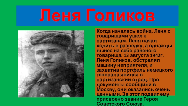 начал ходить в разведку, а однажды вынес на себе раненого товарища. 13 августа 1942г. Леня Голиков, обстрелял машину неприятеля, и захватив портфель немецкого генерала явился в партизанский отряд. Про документы сообщили в Москву, они оказались очень ценными. За этот подвиг ему присвоено звание Героя Советского Союза.