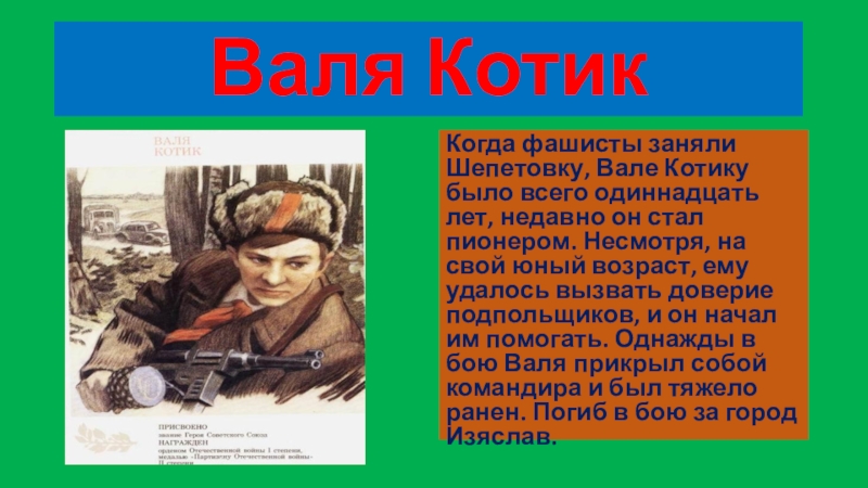 недавно он стал пионером. Несмотря, на свой юный возраст, ему удалось вызвать доверие подпольщиков, и он начал им помогать. Однажды в бою Валя прикрыл собой командира и был тяжело ранен. Погиб в бою за город Изяслав.