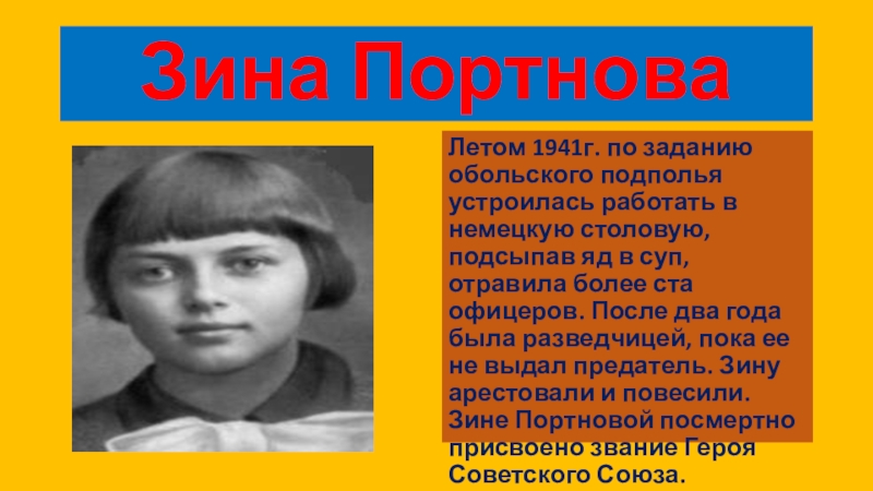 столовую, подсыпав яд в суп, отравила более ста офицеров. После два года была разведчицей, пока ее не выдал предатель. Зину арестовали и повесили. Зине Портновой посмертно присвоено звание Героя Советского Союза.