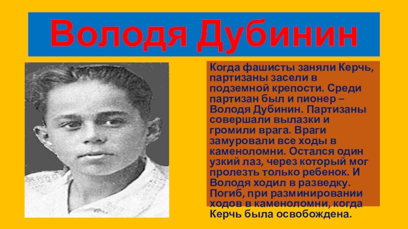 партизан был и пионер – Володя Дубинин. Партизаны совершали вылазки и громили врага. Враги замуровали все ходы в каменоломни. Остался один узкий лаз, через который мог пролезть только ребенок. И Володя ходил в разведку. Погиб, при разминировании ходов в каменоломни, когда Керчь была освобождена.