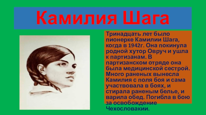 Тринадцать лет было пионерке Камилии Шага, когда в 1942г. Она