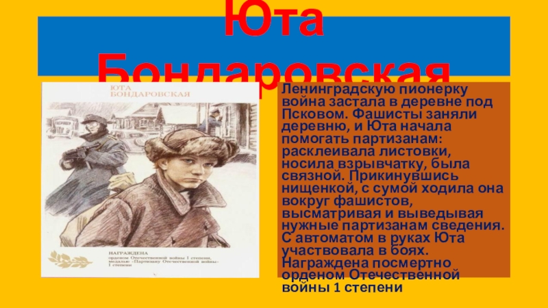 деревню, и Юта начала помогать партизанам: расклеивала листовки, носила взрывчатку, была связной. Прикинувшись нищенкой, с сумой ходила она вокруг фашистов, высматривая и выведывая нужные партизанам сведения. С автоматом в руках Юта участвовала в боях. Награждена посмертно орденом Отечественной войны 1 степени