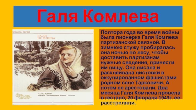 связной. В зимнюю стужу пробиралась она ночью по лесу, чтобы доставить партизанам нужные сведения, принести им пищу. Она писала и расклеивала листовки в оккупированном фашистами родном селе Тарковичи. А потом ее арестовали. Два месяца Галя Комлева провела в гестапо, 20 февраля 1943г. ее расстреляли.