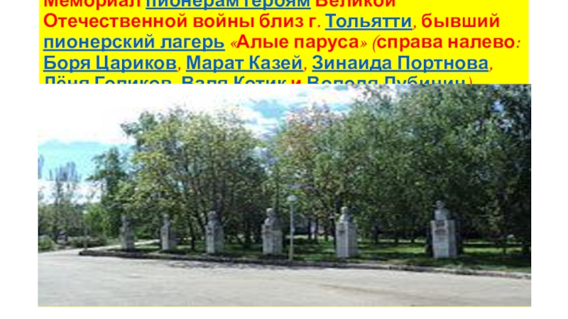 Слайд 14Мемориал пионерам героям Великой Отечественной войны близ г. Тольятти, бывший пионерский