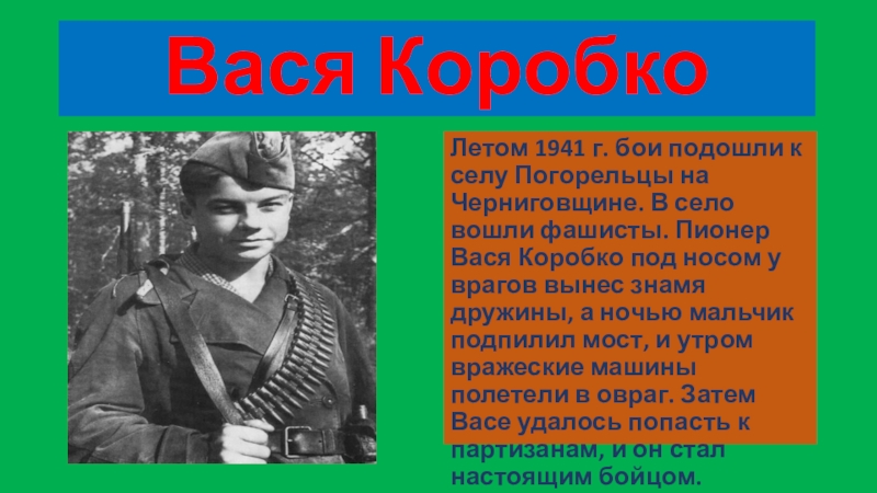 В село вошли фашисты. Пионер Вася Коробко под носом у врагов вынес знамя дружины, а ночью мальчик подпилил мост, и утром вражеские машины полетели в овраг. Затем Васе удалось попасть к партизанам, и он стал настоящим бойцом.