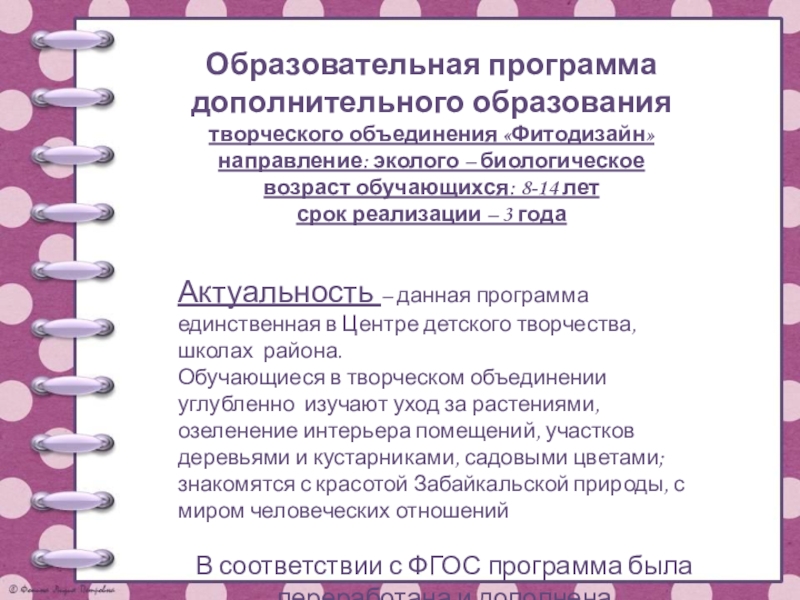 Образовательная программадополнительного образования творческого объединения «Фитодизайн»направление: эколого – биологическоевозраст обучающихся: 8-14 летсрок реализации – 3 года