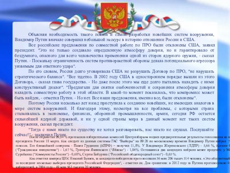 Как отметил зампред ЦИК Николай Булаев, за кандидата-победителя проголосовали 56 млн 206 тысяч 514 человек. «Это абсолютный рекорд за последние несколько выборов президента Российской Федерации", - отметил он. Для сравнения: в 2012 году за Путина проголосовало 45,6 млн избирателей, в 2004 году - 49 млн 563 тысячи 20 человек....