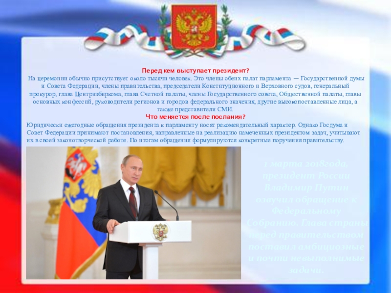 Форма и содержание обращения не регулируются какими-либо специальными законами. О чем пойдет речь — практически полностью определяет президент.