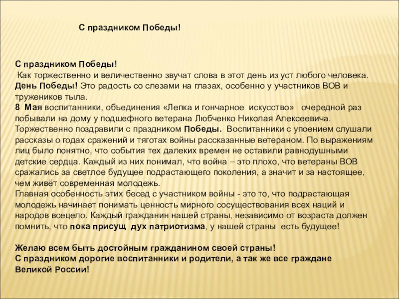 Это сайт презентаций, где можно хранить и обмениваться своими презентациями, докладами, проектами, шаблонами в формате PowerPoint с другими пользователями. Мы помогаем школьникам, студентам, учителям, преподавателям хранить и обмениваться учебными материалами.