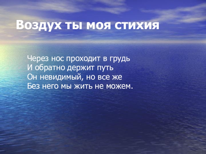 Воздух ты моя стихияЧерез нос проходит в грудьИ обратно держит путьОн невидимый, но все жеБез него мы