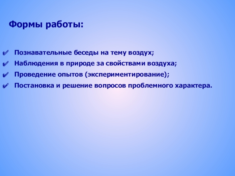 Формы работы:  Познавательные беседы на тему воздух;  Наблюдения в природе за свойствами воздуха;  Проведение