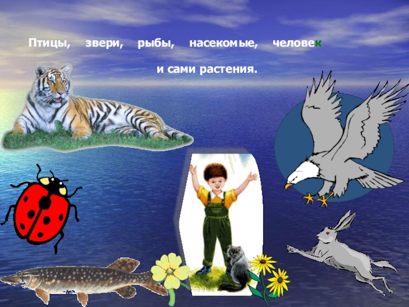 Птицы,звери,рыбы,насекомые,человеки сами растения.