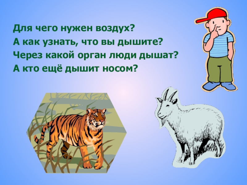 Для чего нужен воздух?А как узнать, что вы дышите?Через какой орган люди дышат?А кто ещё дышит носом?