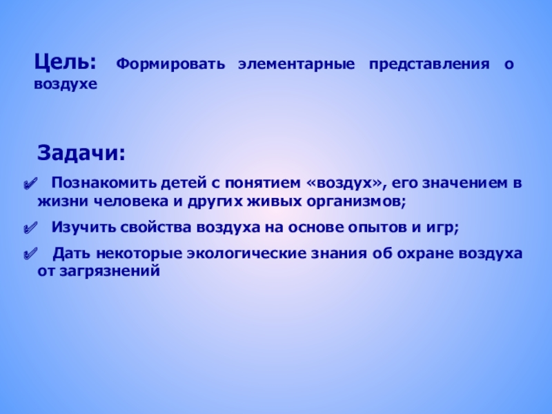 Слайд 3Цель: Формировать элементарные представления о воздухе