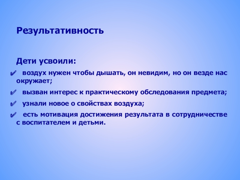 РезультативностьДети усвоили:  воздух нужен чтобы дышать, он невидим, но он везде нас окружает;  вызван интерес