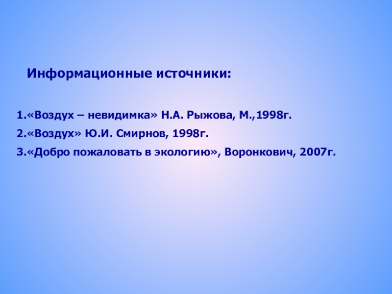 Информационные источники:«Воздух – невидимка» Н.А. Рыжова, М.,1998г.«Воздух» Ю.И. Смирнов, 1998г.«Добро пожаловать в экологию», Воронкович, 2007г.