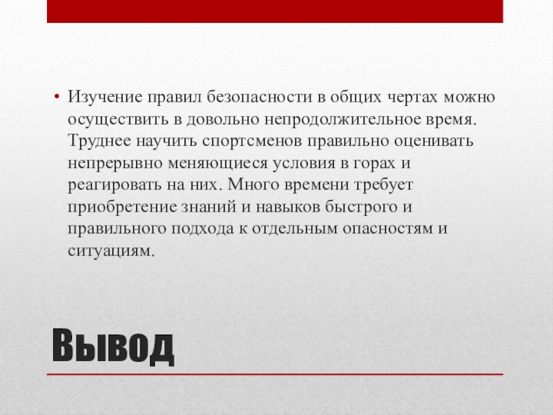 время. Труднее научить спортсменов правильно оценивать непрерывно меняющиеся условия в горах и реагировать на них. Много времени требует приобретение знаний и навыков быстрого и правильного подхода к отдельным опасностям и ситуациям.