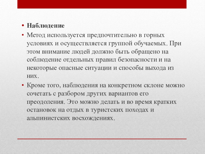 Кроме того, наблюдения на конкретном склоне можно сочетать с разбором других вариантов его преодоления. Это можно делать и во время кратких остановок на отдых в туристских походах и альпинистских восхождениях.