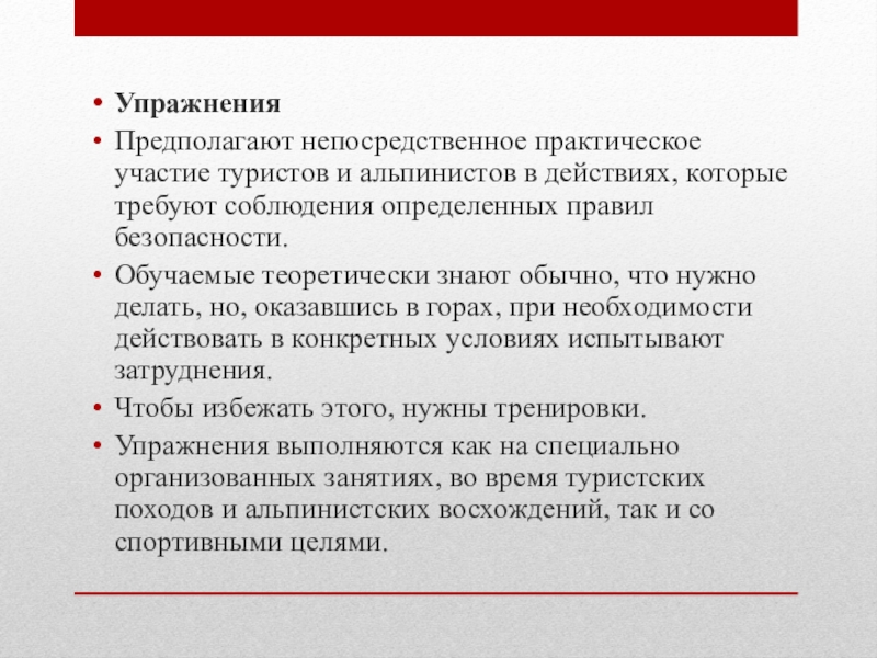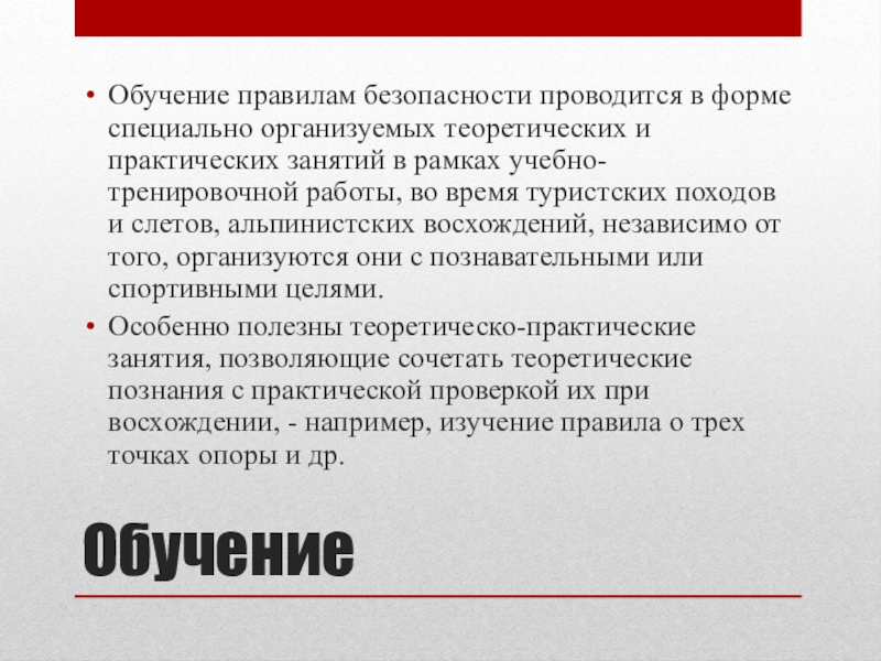 Особенно полезны теоретическо-практические занятия, позволяющие сочетать теоретические познания с практической проверкой их при восхождении, - например, изучение правила о трех точках опоры и др.