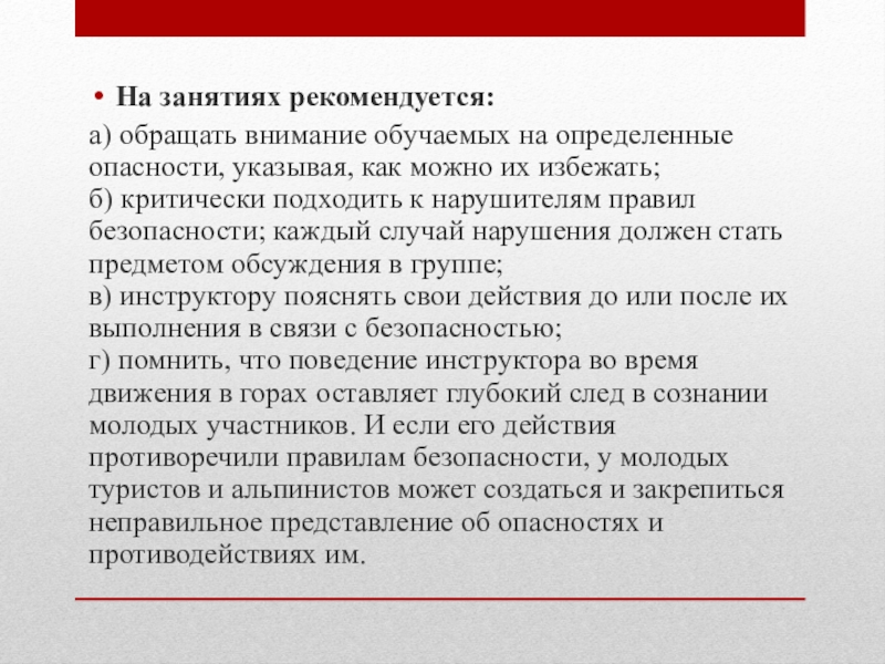 г) помнить, что поведение инструктора во время движения в горах оставляет глубокий след в сознании молодых участников. И если его действия противоречили правилам безопасности, у молодых туристов и альпинистов может создаться и закрепиться неправильное представление об опасностях и противодействиях им.
