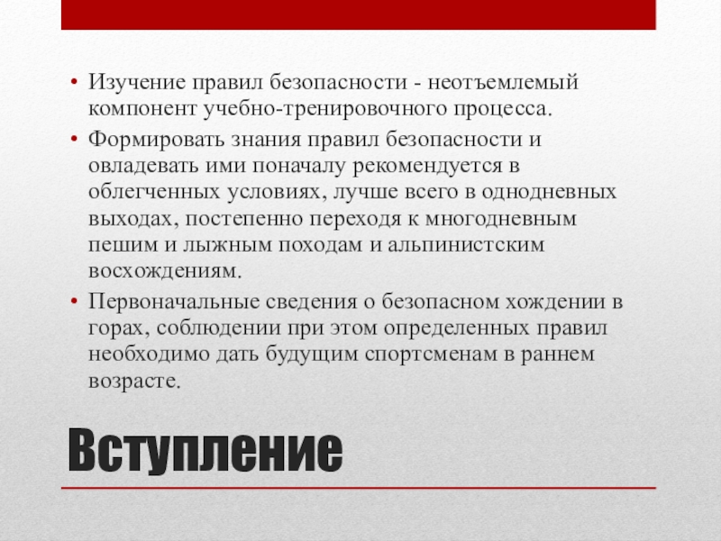 правил безопасности и овладевать ими поначалу рекомендуется в облегченных условиях, лучше всего в однодневных выходах, постепенно переходя к многодневным пешим и лыжным походам и альпинистским восхождениям.
