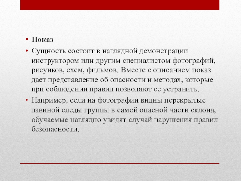 рисунков, схем, фильмов. Вместе с описанием показ дает представление об опасности и методах, которые при соблюдении правил позволяют ее устранить.