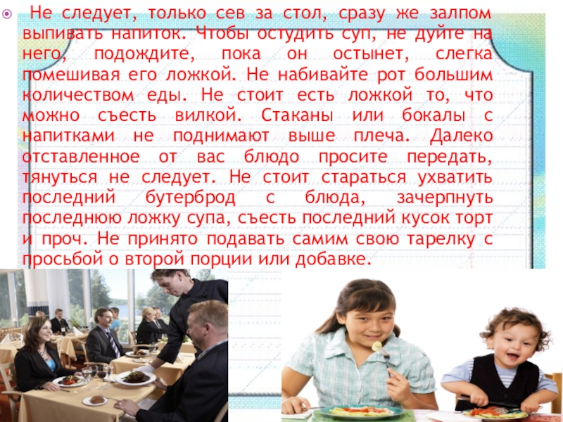 напиток. Чтобы остудить суп, не дуйте на него, подождите, пока он остынет, слегка помешивая его ложкой. Не набивайте рот большим количеством еды. Не стоит есть ложкой то, что можно съесть вилкой. Стаканы или бокалы с напитками не поднимают выше плеча. Далеко отставленное от вас блюдо просите передать, тянуться не следует. Не стоит стараться ухватить последний бутерброд с блюда, зачерпнуть последнюю ложку супа, съесть последний кусок торт и проч. Не принято подавать самим свою тарелку с просьбой о второй порции или добавке.
