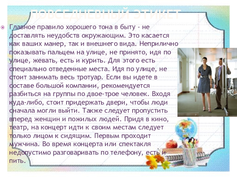 окружающим. Это касается как ваших манер, так и внешнего вида. Неприлично показывать пальцем на улице, не принято, идя по улице, жевать, есть и курить. Для этого есть специально отведенные места. Идя по улице, не стоит занимать весь тротуар. Если вы идете в составе большой компании, рекомендуется разбиться на группы по двое-трое человек. Входя куда-либо, стоит придержать двери, чтобы люди сначала могли выйти. Также следует пропустить вперед женщин и пожилых людей. Придя в кино, театр, на концерт идти к своим местам следует только лицом к сидящим. Первым проходит мужчина. Во время концерта или спектакля недопустимо разговаривать по телефону, есть и пить.