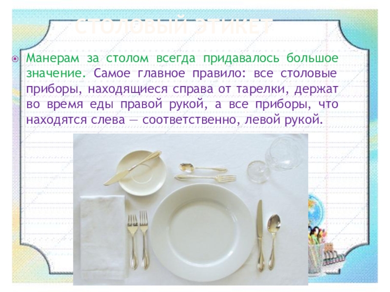 Манерам за столом всегда придавалось большое значение. Самое главное правило: