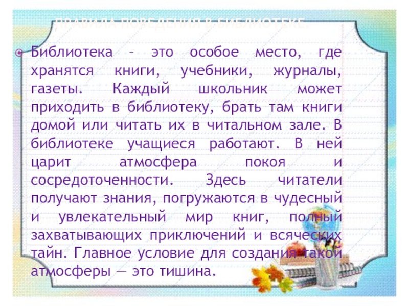 учебники, журналы, газеты. Каждый школьник может приходить в библиотеку, брать там книги домой или читать их в читальном зале. В библиотеке учащиеся работают. В ней царит атмосфера покоя и сосредоточенности. Здесь читатели получают знания, погружаются в чудесный и увлекательный мир книг, полный захватывающих приключений и всяческих тайн. Главное условие для создания такой атмосферы — это тишина.