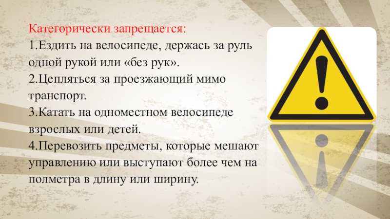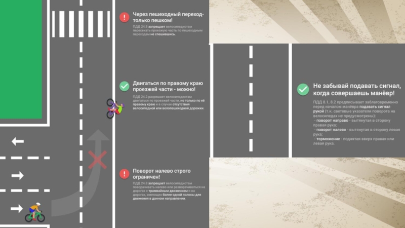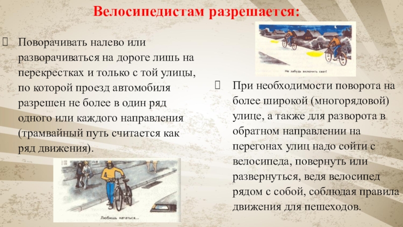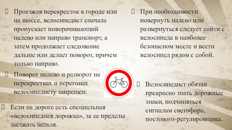Поворот налево и разворот на перекрестках и перегонах велосипедисту запрещен.