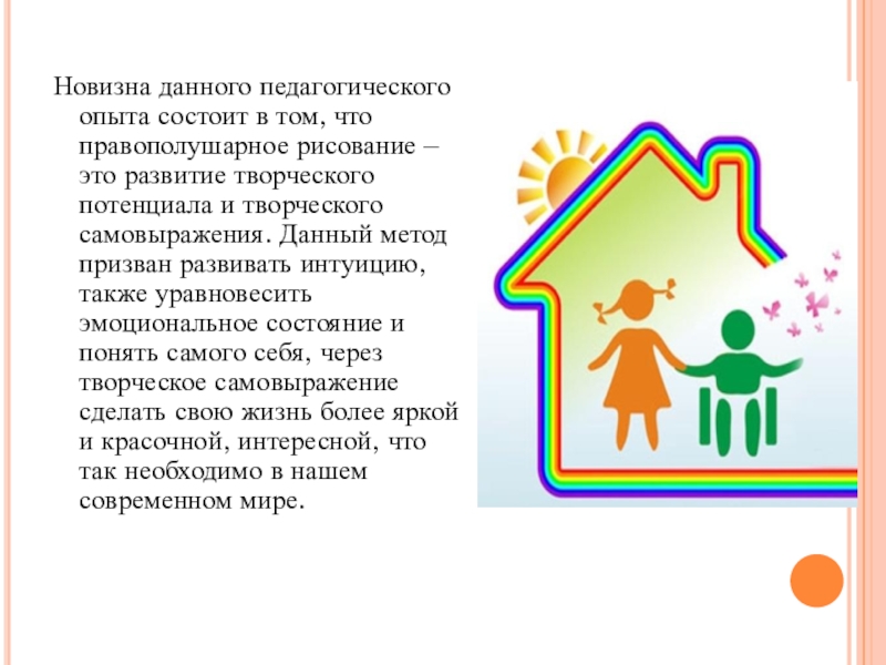Слайд 9Новизна данного педагогического опыта состоит в том, что правополушарное рисование –